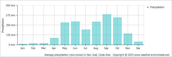 Costa Rica is a tropical country, due to its proximity to the equator it does not have a winter or summer season. A distinction is generally made in the Pacific region between rainy season (May to November) and dry season (December to April), in the Atlantic region of influence by months of heavy rain (December to April) and months of low rainfall. The rainy season is from May to November, during the months of December to April there is very little or no rain. The country’s average rainfall is around 100 inches. During the rainy season, you will experience real “tropical downpours” for 2 – 3 hours in the afternoon; the rest of the day is warm and sunny. (Tierra Verde 2016)