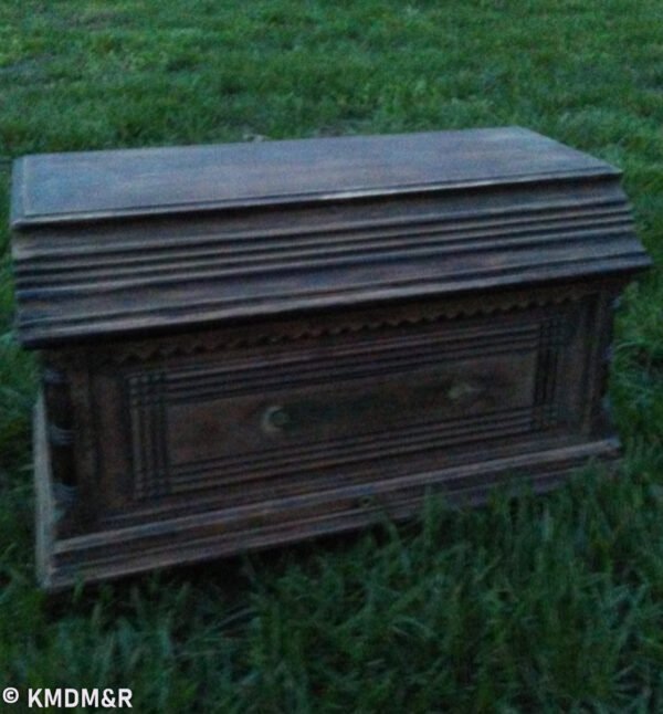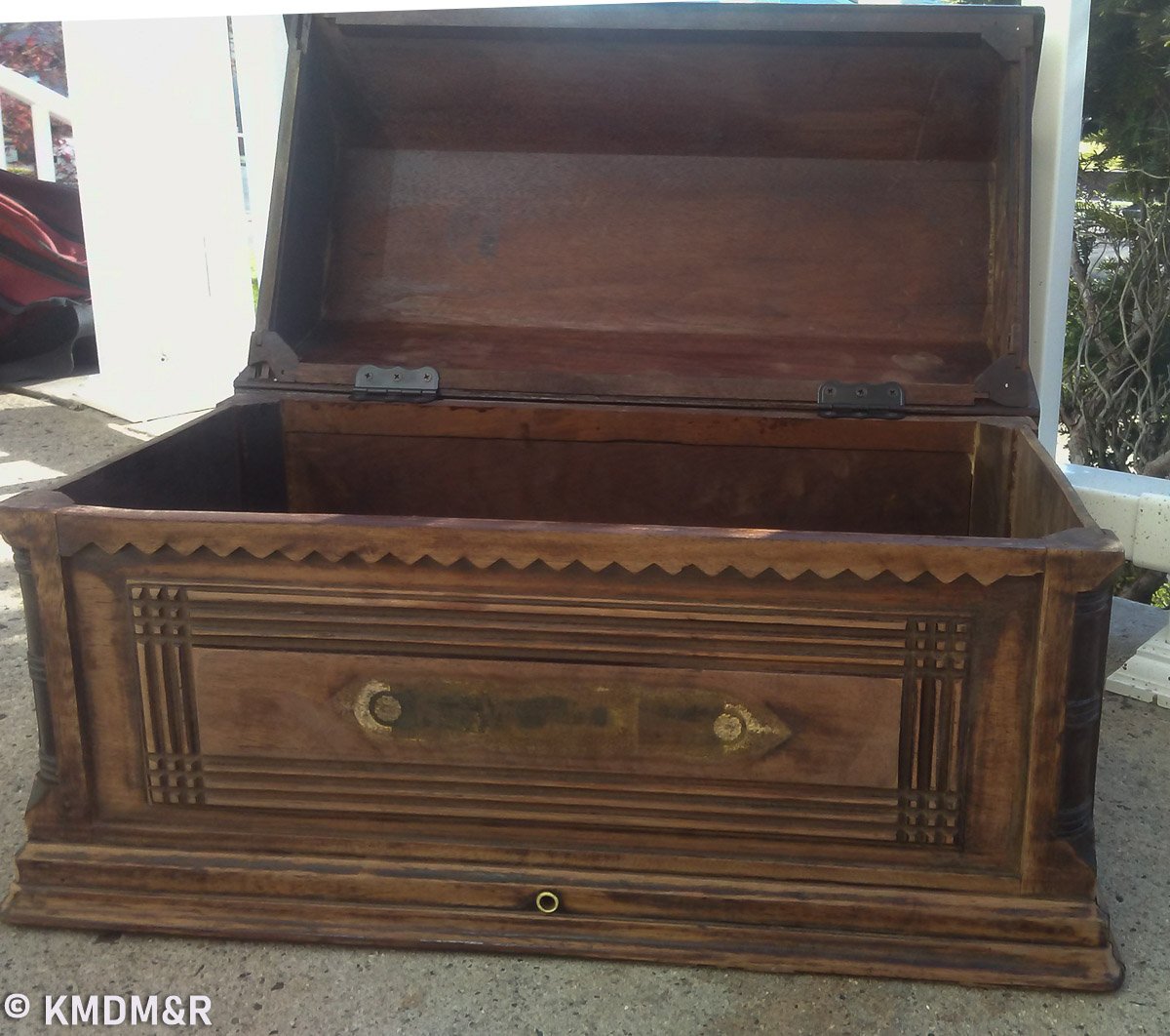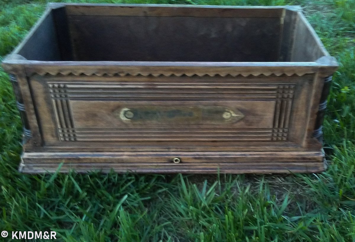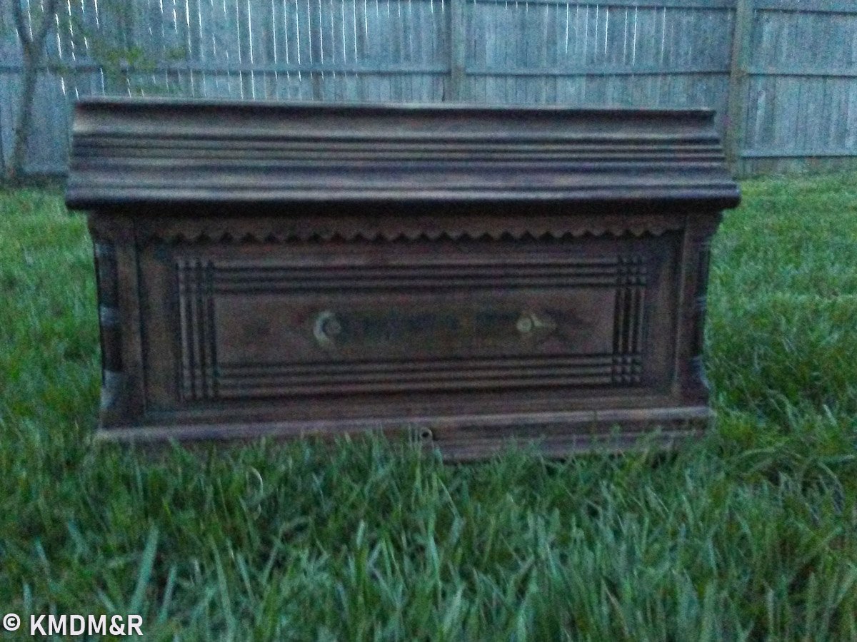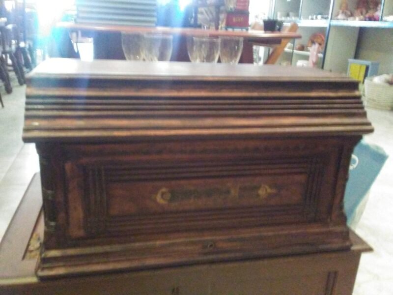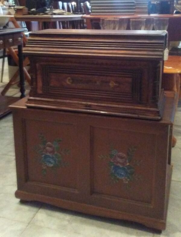 An Antique Sewing Machine cover had been sitting in the Antique Shop for a long time.
